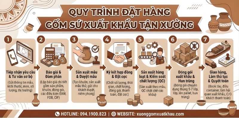 Việc nắm rõ 7 bước trên không chỉ giúp bạn chủ động hơn trong việc đặt hàng mà còn giảm thiểu rủi ro, đảm bảo nhận được lô hàng gốm sứ Bát Tràng xuất khẩu đúng chất lượng và tiến độ. Hãy bắt đầu dự án của bạn ngay hôm nay. Liên hệ với đội ngũ chuyên gia của Xưởng Gốm Xuất Khẩu để nhận tư vấn và báo giá chi tiết nhé!