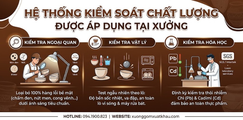 Bên cạnh đó, với mỗi lô hàng, chúng tôi sẽ lấy mẫu ngẫu nhiên để gửi đi kiểm định tại các phòng thí nghiệm độc lập uy tín như SGS, Intertek. Việc này nhằm xin cấp Test Report (Báo cáo kiểm nghiệm) đáp ứng các tiêu chuẩn của nước nhập khẩu như FDA (CFR 21) của Mỹ, LFGB của Đức hay REACH của Châu Âu. Đây là những chứng nhận chất lượng gốm sứ xuất khẩu cần thiết để thông quan và lưu hành sản phẩm.
