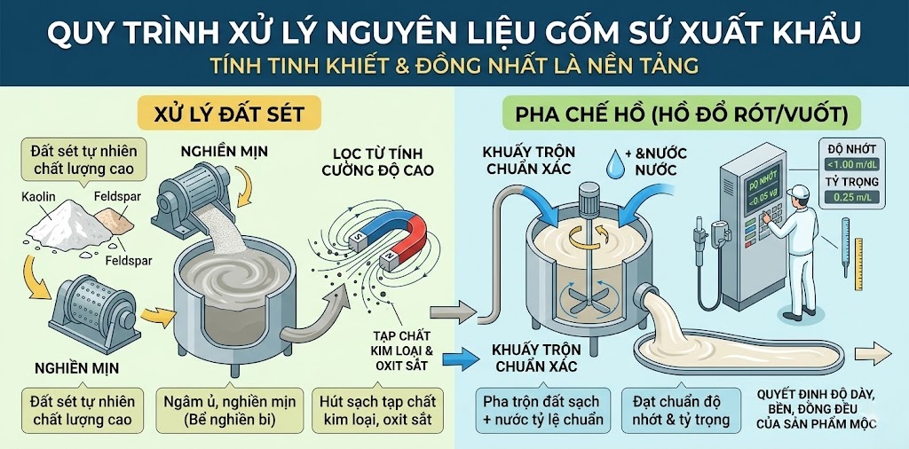 Công đoạn đầu tiên và nền tảng nhất chính là khâu xử lý nguyên liệu, bởi thị trường gốm sứ xuất khẩu đòi hỏi nguồn nguyên liệu đầu vào phải đạt độ tinh khiết và đồng nhất tuyệt đối. Mọi sai sót ở bước này đều không thể khắc phục ở các công đoạn sau.