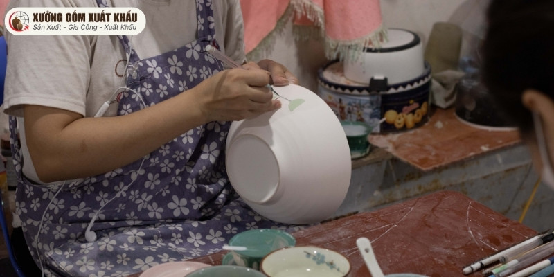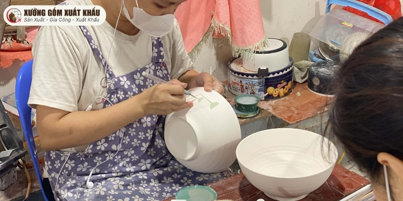• Trang trí dưới men: Đối với các họa tiết vẽ tay, thợ thủ công sẽ vẽ trực tiếp lên sản phẩm sành xốp bằng màu gốm chuyên dụng. Sau đó, sản phẩm mới được nhúng men. Kỹ thuật này đảm bảo họa tiết nằm sâu dưới lớp men, bền vĩnh cửu và không bao giờ phai màu khi sử dụng.