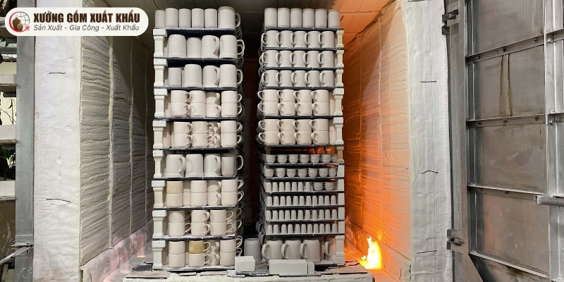 Hàng mộc sau khi hoàn thiện sẽ được xếp vào lò và nung sơ bộ ở nhiệt độ khoảng 800°C – 900°C. Quá trình này không nhằm mục đích làm chín sản phẩm mà đóng vai trò chuẩn bị cực kỳ quan trọng.