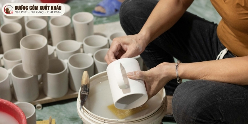 • Thợ nhúng men phải là người có kinh nghiệm lâu năm để đảm bảo lớp men phủ đều, không quá mỏng (dễ lộ xương gốm) hay quá dày (gây chảy men, dính men khi nung).