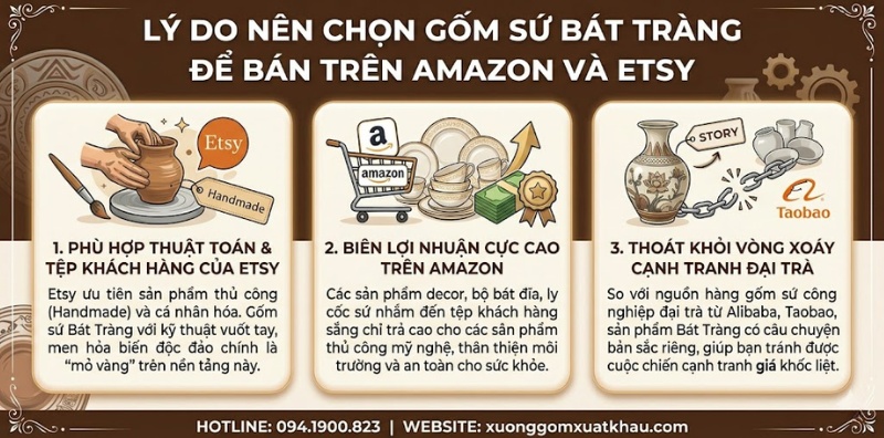 Lựa chọn gốm sứ Bát Tràng để kinh doanh trên các sàn E-commerce quốc tế như Amazon và Etsy là một quyết định chiến lược thông minh. Dòng sản phẩm này sở hữu những đặc tính độc đáo, đáp ứng đúng nhu cầu của thị trường Âu-Mỹ hiện nay.